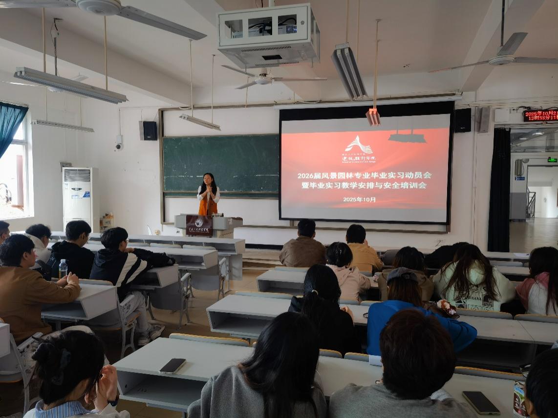 2025年10月21日,风景园林专业2026届毕业实习动员会于10教410教室举行。会议由风景园林教研室主任盛丽主持,李国庆、周翔宇两位指导老师及2022级风景园林专业全体学生参会。会议结合往届经验,重点强调了实习期间的安全管理与纪律要求,明确学生需通过“校友邦”平台按时提交实习材料,并遵守单位规章制度。李国庆在总结中提醒学生警惕职场风险,加强自我保护意识,同时鼓励学生主动将实习与就业规划结合,提升职业竞争力。