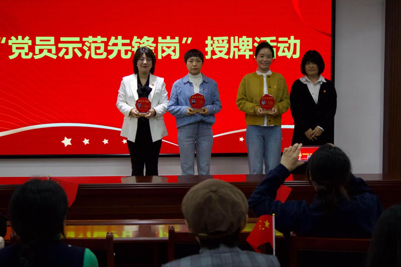 研讨交流让大家明确了“学精神、用精神”的方向,而精神的传承更需要在岗位实践中落地。为推动红岩精神落地岗位实践,支部举行了“党员示范先锋岗”授牌仪式。教学先锋岗刘婷、科研先锋岗王晗、行政先锋岗黄微作为代表先后分享事迹,她们将红岩精神融入教学改革、科研攻关与行政服务的实践,为全体党员树立标杆。党总支书记唐湘晖同志为先锋岗党员授牌,获授牌党员现场作出岗位承诺,接受师生监督。