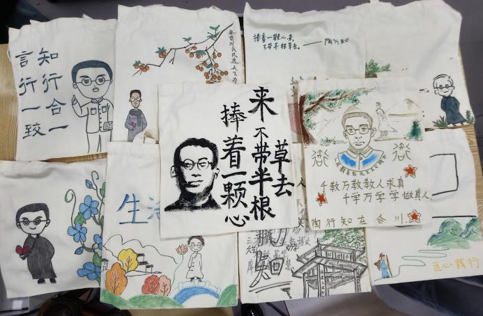 文创帆布袋创作以空白布袋为创造载体,用纺织颜料、马克笔等,以陶行知名言、教育场景等为设计元素,亲手打造出兼具实用性与思想温度的专属文创作品。