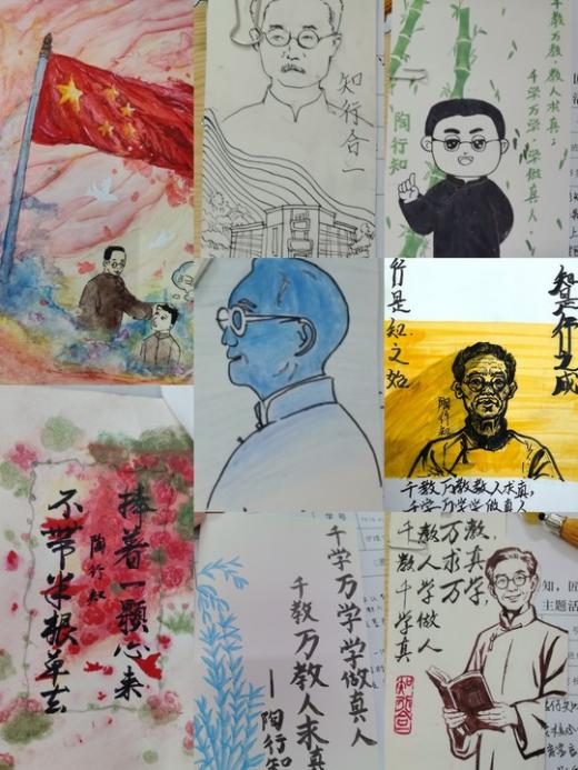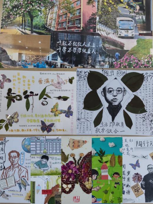 教育空间拼贴画则以废旧杂志、纸张为基础,通过拼贴艺术还原“社会即学校”的多元教育场景,在践行低碳理念的同时,对陶行知教育思想进行了生动诠释。