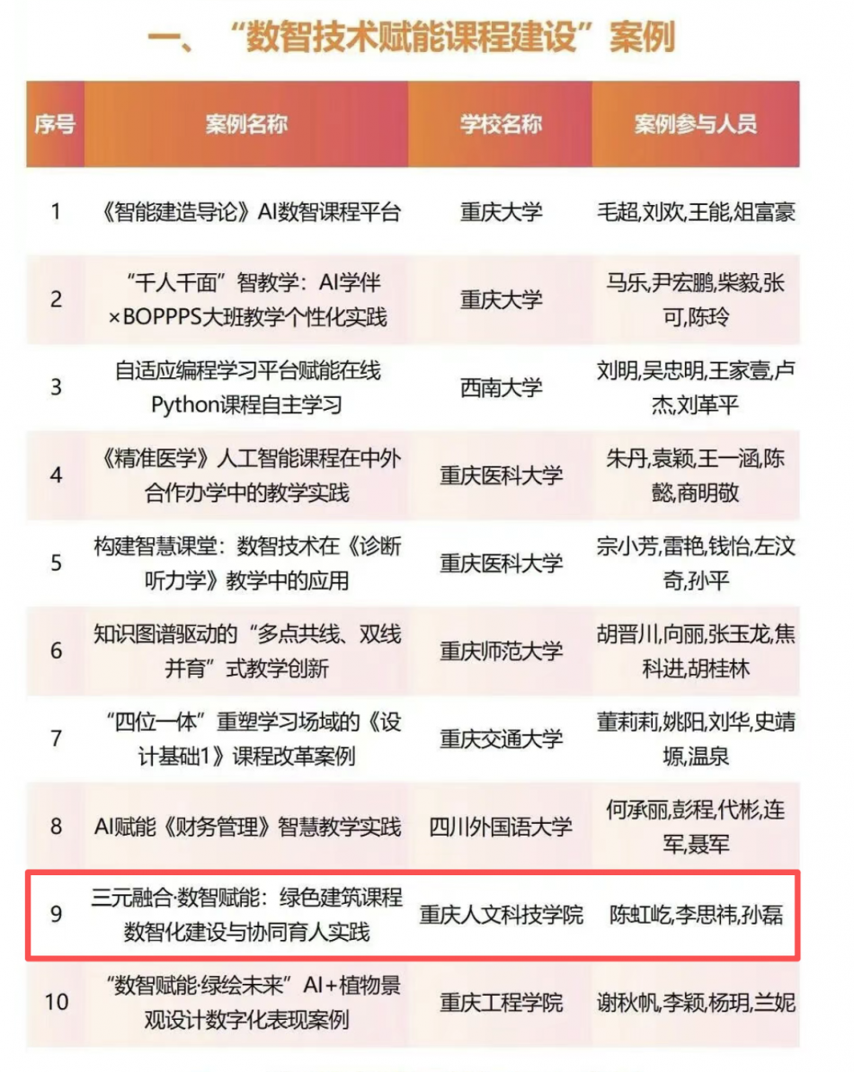 祝贺我院《三元融合·数智赋能:绿色建筑课程数智化建设与协同育人实践》案例成功入选第六届全国智课教育创新大会优秀案例!在12月13日于武汉召开的第六届全国智课教育创新大会上,我院陈虹屹、李思祎、孙磊三位老师主持的该案例,经大会评审,入选“数智技术赋能课程建设”类别优秀案例。